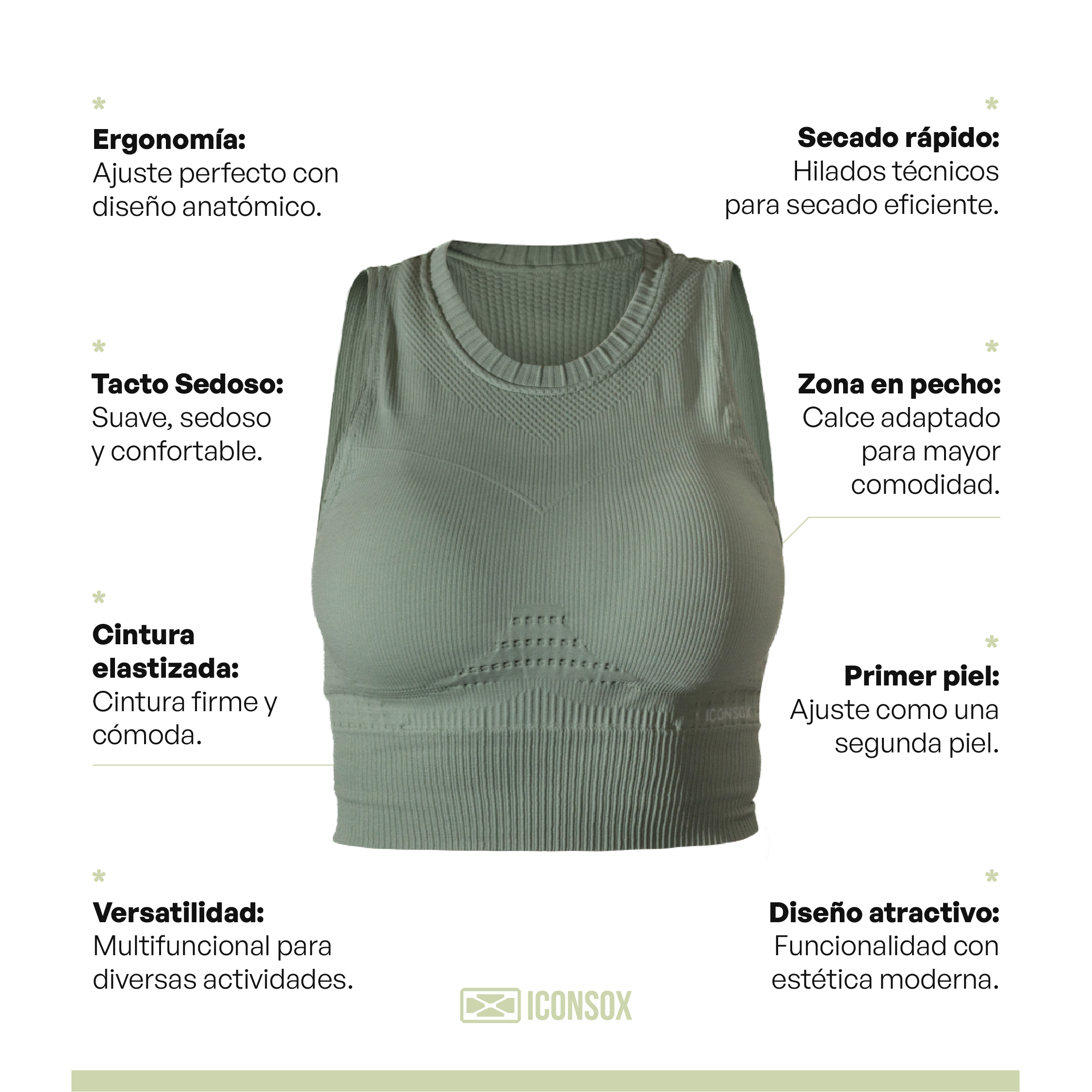 • Tecnología Seamless: Estructura sin costuras con texturas específicas en cada área